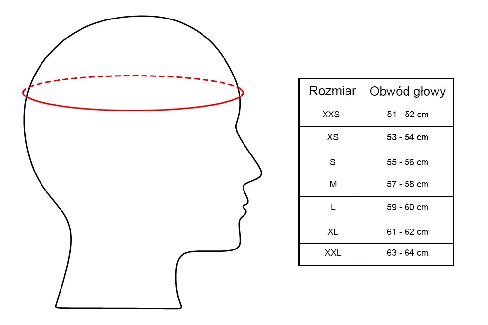 Obwód głowy należy zmierzyć tuż nad uszami. Kask powinien być dobrze dopasowany, ściśle przylegać do głowy, ale nie uciskać żadnej części.