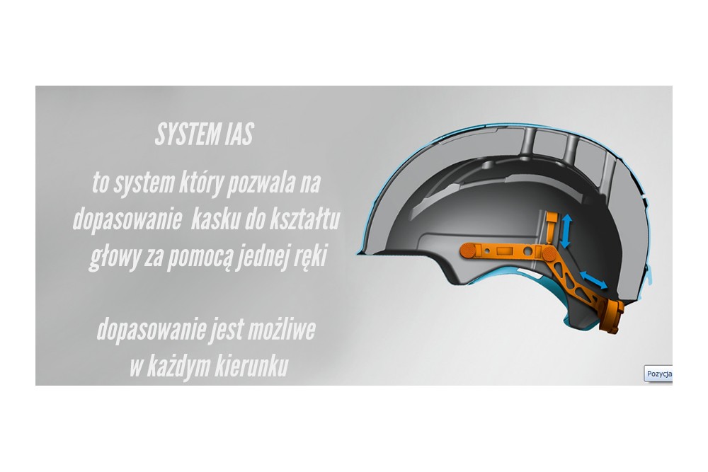 Technologia 3D IAS 2.0 ,która pozwala na optymalną regulację, tak aby kask spełniał swoje podstawowe funkcje, poprzez idealnie dopasowanie zarówno w obwodzie, jak i głębokości osadzenia na głowie