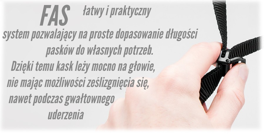 System FAS, pozwalający na proste dopasowanie długości pasków do własnych potrzeb. Dzięki temu kask leży mocno na głowie, nie mając możliwości ześlizgnięcia się, nawet podczas gwałtownego uderzenia.