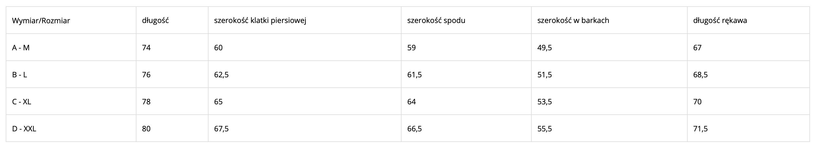 - wypełnienie: 100% poliester, 120 g/m2 (korpus), 80 g/m2 (rękawy)
