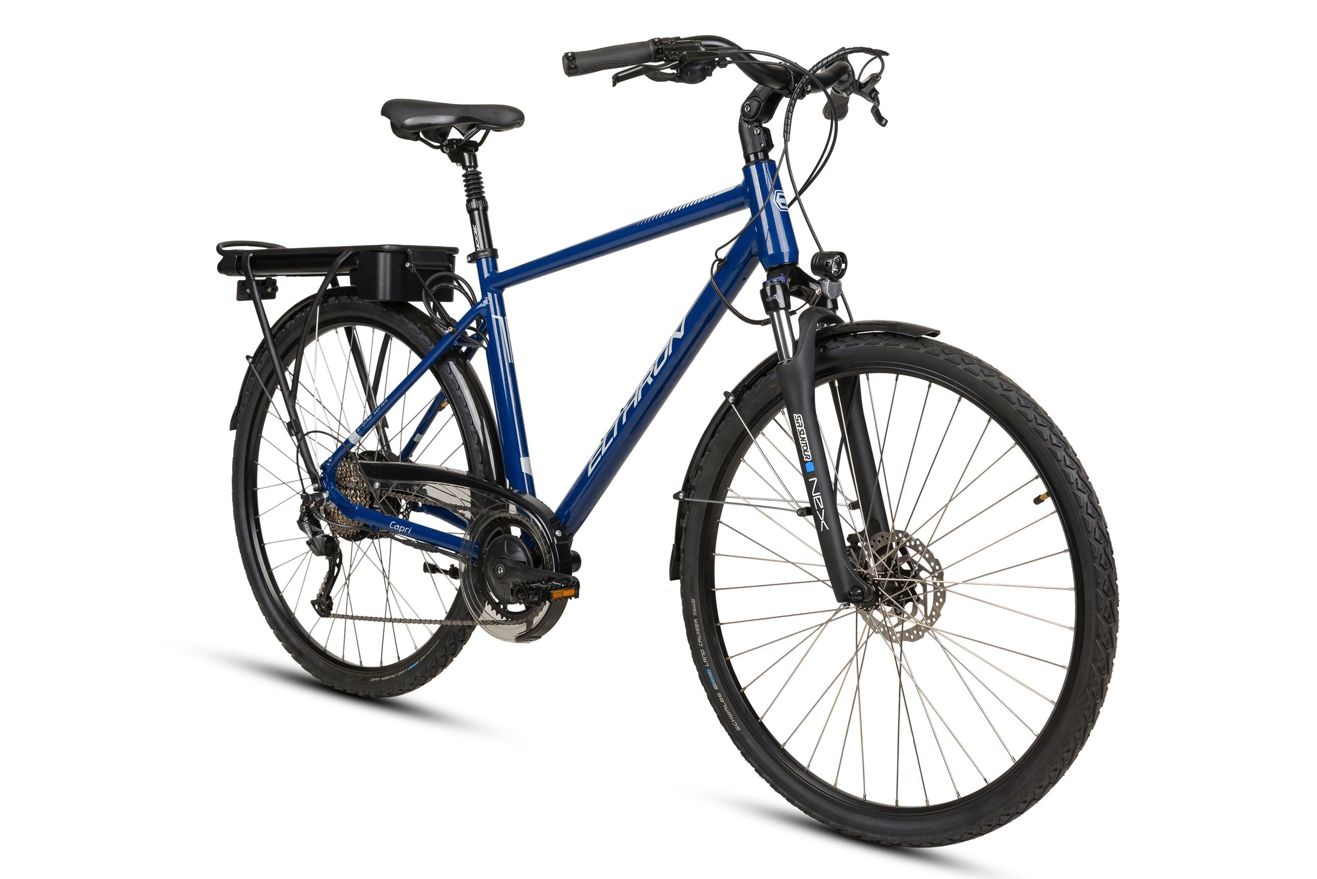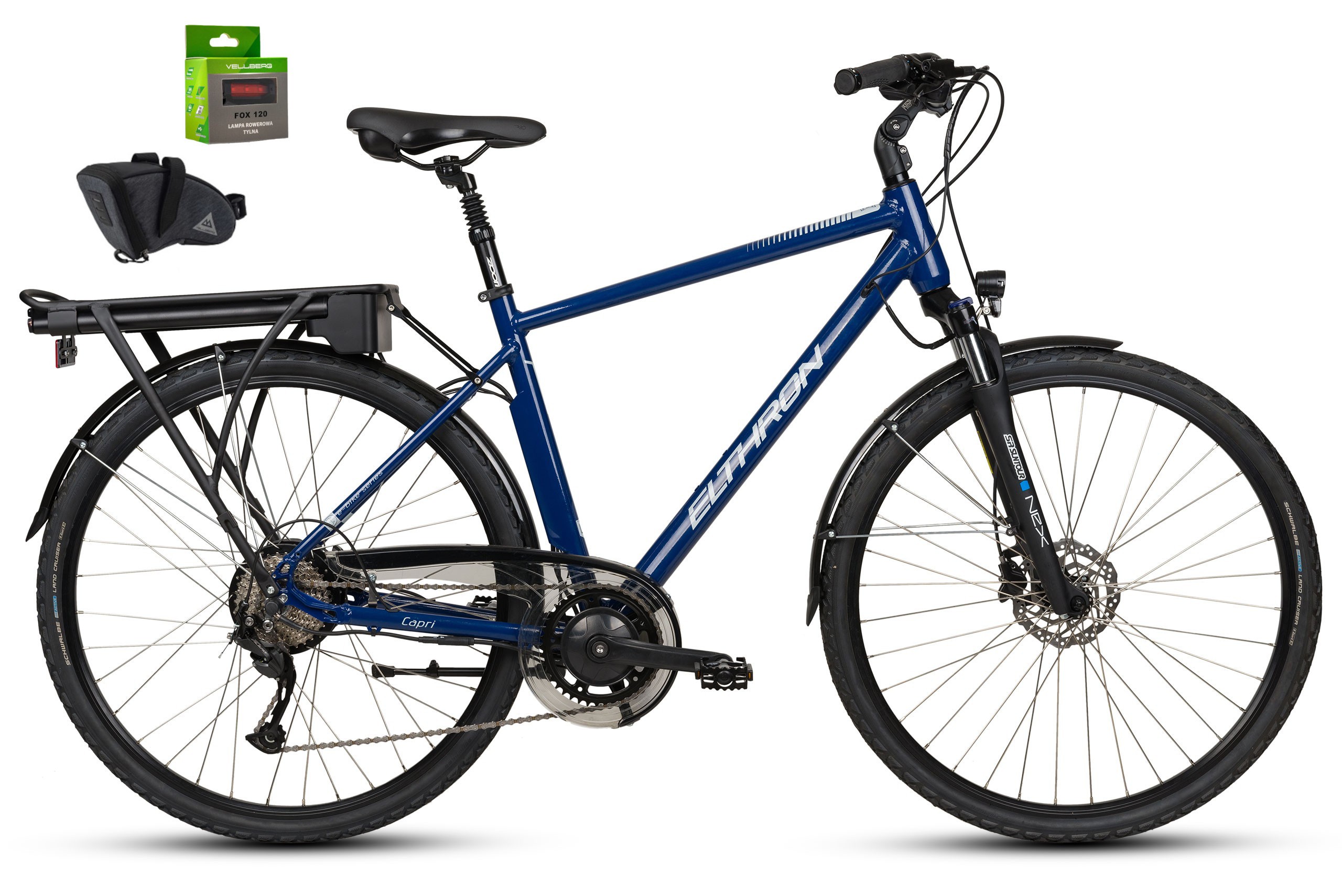 Rower TREKKINGOWY Elthron serii Capri zbudowany na kołach o rozmiarze 28 cali z silnikiem w pieście. Doskonały do jazdy po mieście oraz po leśnych ścieżkach. Idealny na długie wyprawy z sakwami. Mocna aluminiowa rama jest produkowana w Polsce.