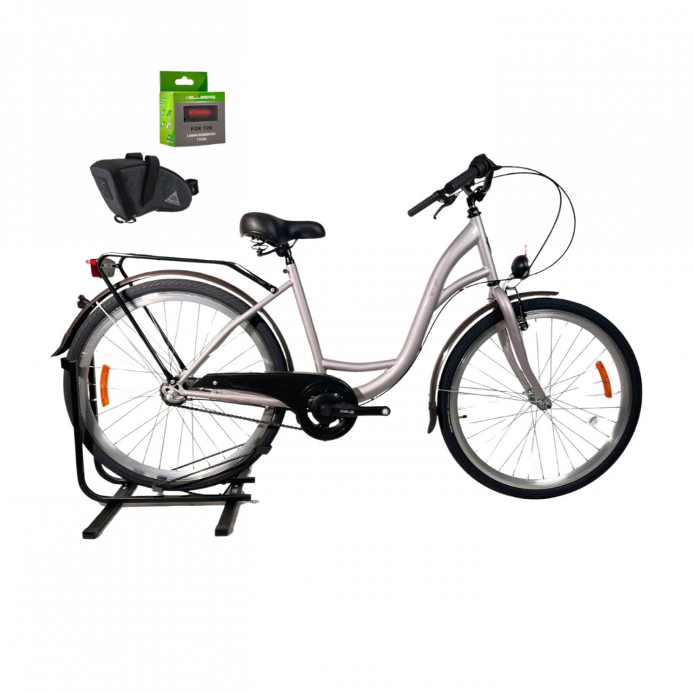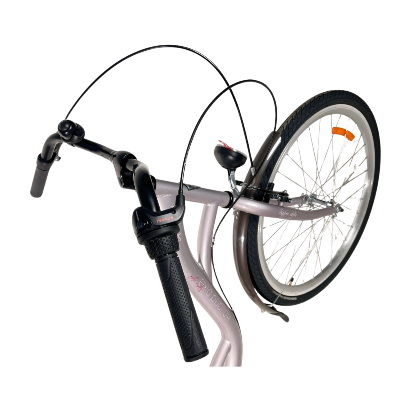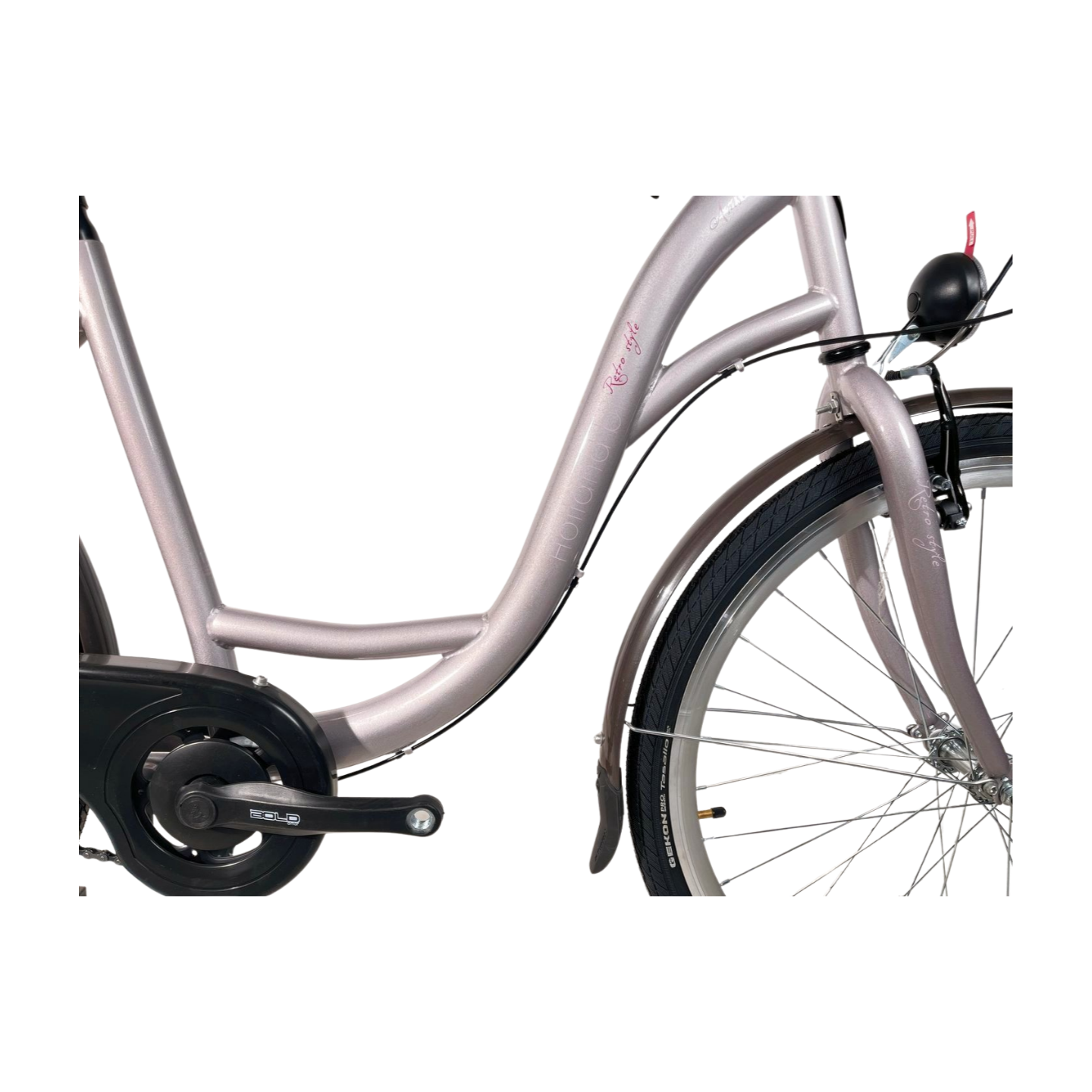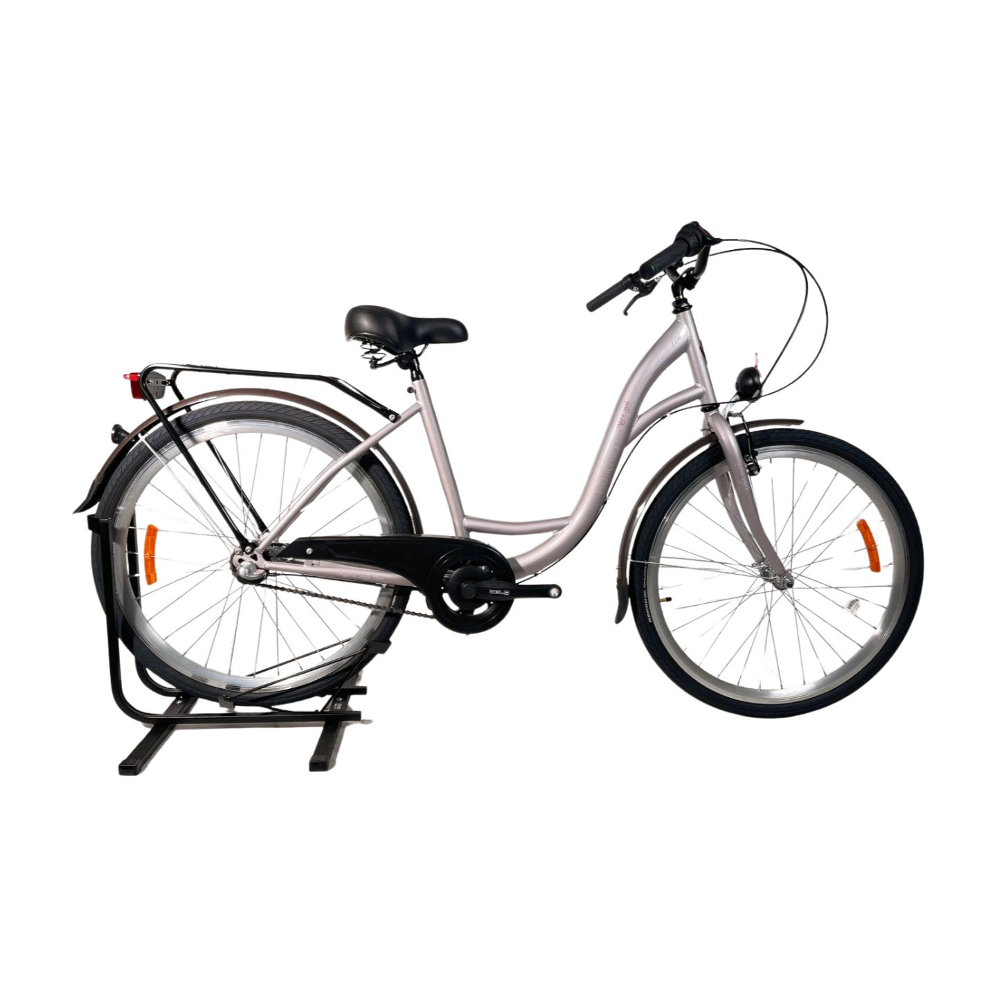 Rower 26 STORM Amsterdam ECO to doskonały wybór dla kobiet, które szukają pojazdu o wyjątkowym stylu i niezawodności. Jego stalowa rama w szarym kolorze nie tylko wyróżnia się estetyką, ale także zapewnia trwałość i solidność. Dodatkowo, stalowy widelec i piasta przednia gwarantują płynność jazdy w każdym terenie, oferując wyjątkową stabilność.