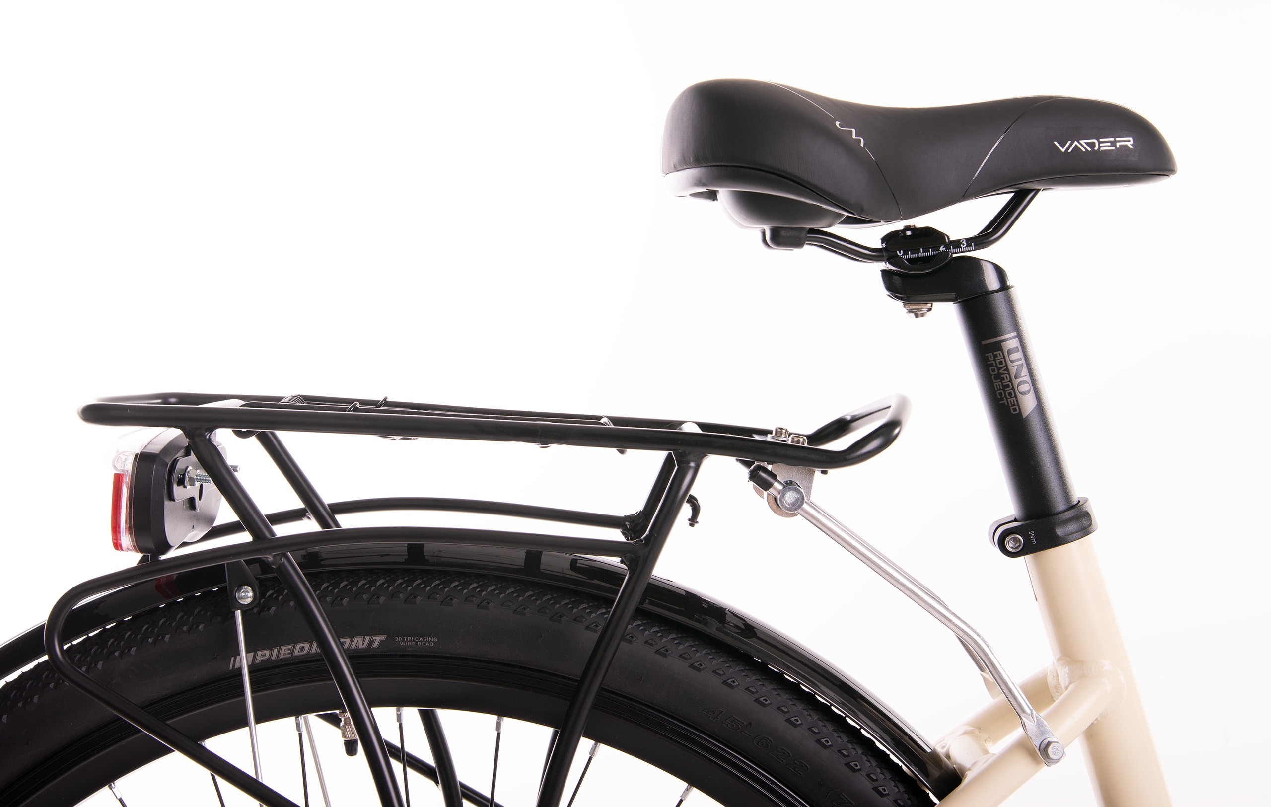 - Dodatki: Podpórka, dzwonek, błotniki winylowe, bagażnik, oświetlenie LED na baterie.