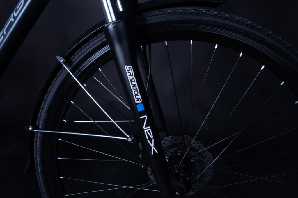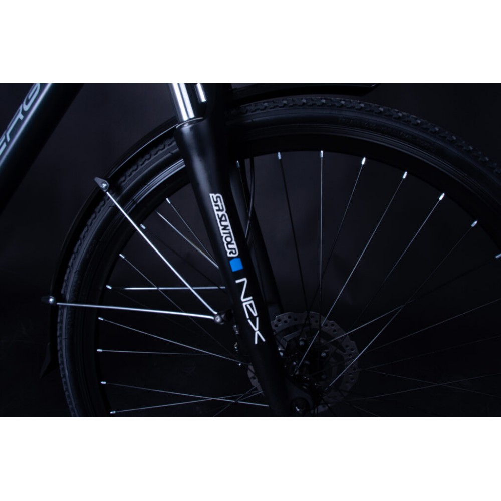 - Komfortowa jazda: Widelec Suntour NEX oraz hydrauliczne hamulce tarczowe Shimano MT-200 gwarantują płynność prowadzenia i bezpieczeństwo na drodze.